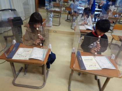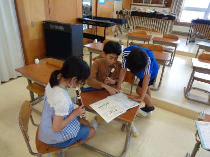 音楽では、歌を歌ったりリコーダーを吹いたりしています。リコーダーでは、小さな約束という曲を、グループでパートごとにわかれて練習をはじめました。友達同士で教え合ったり、聞き合ったりする姿がすてきでした。