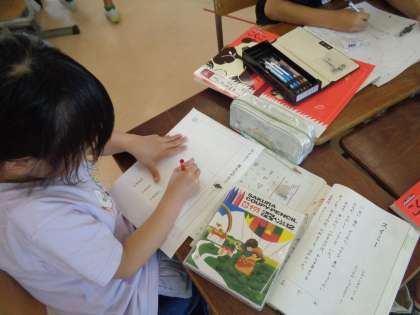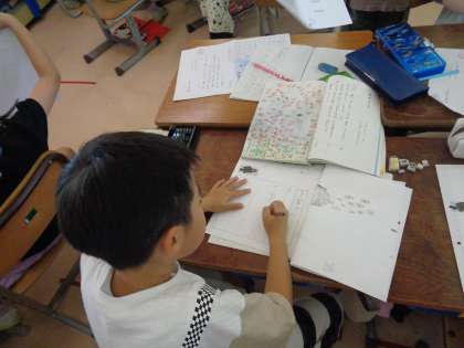 今日の国語は、スイミーの一場面をみんなで音読し、スイミーの気持ちを考えました。兄弟と鬼ごっこをして楽しい気持ち、一人だけ黒いから恥ずかしい気持ちなどと考えていました。最後には、スイミーになりきって日記を書きました。1場面は楽しい気持ちと考える人が多いようです。