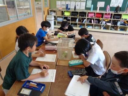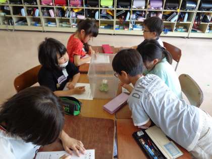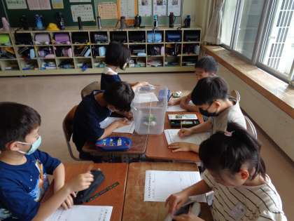今日は前回観察してから少し間があいての観察になったため、子ども達は幼虫がかなり大きくなっていることにとても驚いている様子でした。えさを食べているところがよく見える!など、じっくりと観察していました。