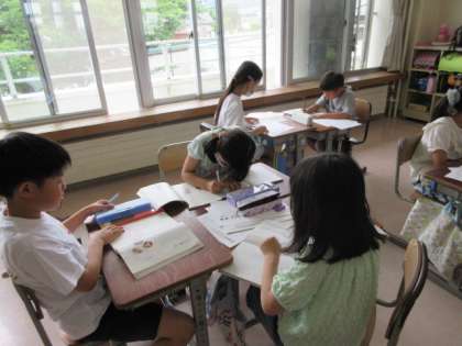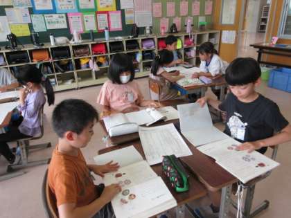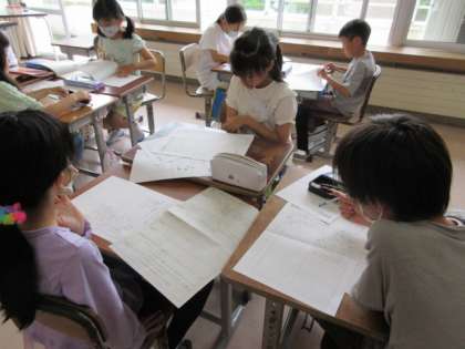 国語「こまを楽しむ」の学習では、グループで計画を立てて取り組んでいます。段落をつけたり、内容についてまとめたりしながら、文の工夫とわかりやすさについて学んでいます。