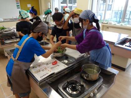 今日は、家庭科でほうれんそうのおひたしを作りました。野菜をゆでたり、包丁で食べやすい大きさに切ったり手際よくできました。家でもぜひ作ってみて下さいね。