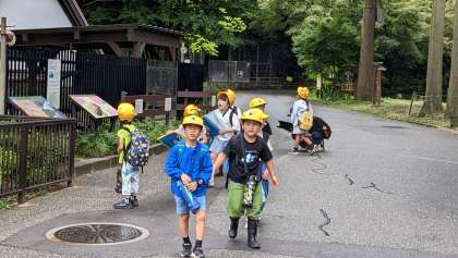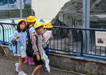 小雨が降っていますが 雨具を身につけるほどではありません。 バス酔いする子はいませんでした。グループごとに見学を始めました