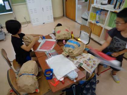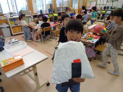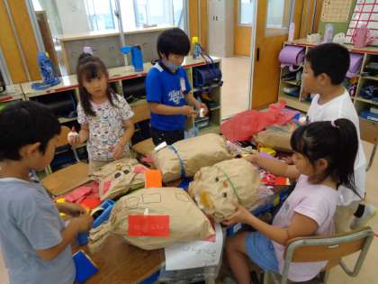 今日の図工は、紙をくしゃくしゃにしたものを袋に入れていろいろなものを作りました。魚やおにぎり、ねこなど、いろいろなものに可愛く変身していました。