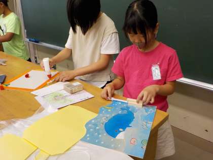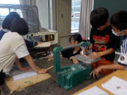 図工、糸のこスイスイです。糸のこを上手に使って思い思いの形に木を切ったり、色をつけたりして仕上げていきます。ホワイトボードマーカーを置く場所も、木を組み合わせてうまく作っていきます。完成が近づいてきました。