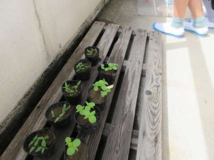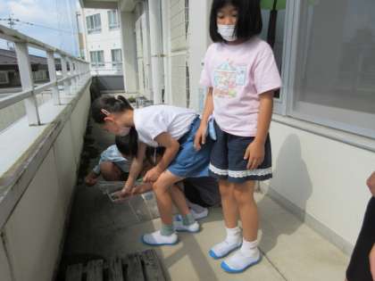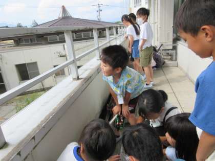 理科の学習で卵から育てたモンシロチョウがサナギからかえり、きれいなチョウになりました。観察を終えて、放しました。名残惜しそうに近くに止まりながら空へ飛んでいきました。