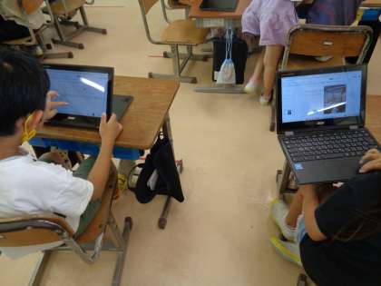 生活では、まちたんけんで見つけたすてきを、スライドにまとめています。使い方に慣れてきた子供たちは、文字の大きさや色を変えて、分かりやすくまとめています。