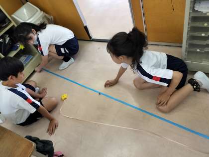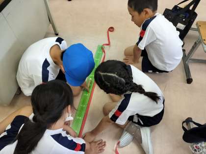 グループの友達と協力して、紙テープで1.453mの長さをつくりました。