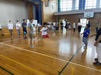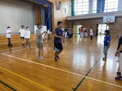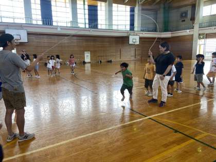 8の字跳びでは、男女に分かれて数を競い合いました。保護者の方も一緒に跳びました。お父さん方は、間を空けずに跳び続けていました。さすがですね。結果は1対1の引き分けで全員お菓子をもらうことができました。楽しい時間を過ごせました。