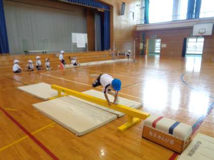 今日は4つのコースに分かれてマット遊びを行いました。動物歩きをするアニマルワールド、前回りや後ろ回りに挑戦する坂道ワールド、逆立ちに挑戦する壁登りワールドなど、いろいろな動きに挑戦しています。