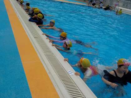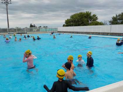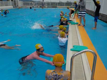 天気が心配されましたが、1時間目にプールに入りました。ビート板を使って体を浮かせながら少しでも泳ぐ距離をのばせるようにしたり、クロールの手のかきかたを練習したりしました。