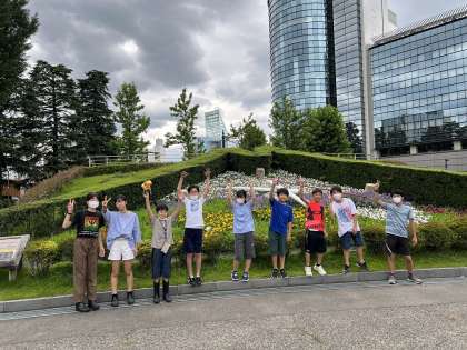 途中、県庁前公園に立ち寄り、大噴水や花時計を見ました。子供達はその大きさに驚いていました。