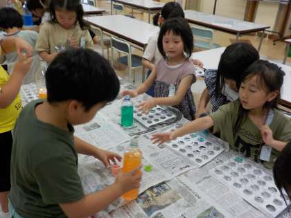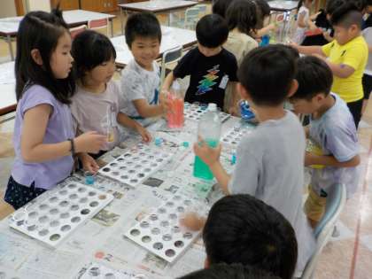 色水の美しさを見付けたり、混ぜたときに色が変化することを楽しんだりする学習をしました。