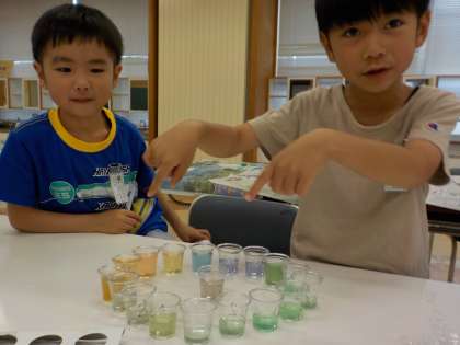 班の友達と協力して、色の濃さの順で並べたり、虹に見えるように並べたりして、つくった色水を楽しく鑑賞することもできました。