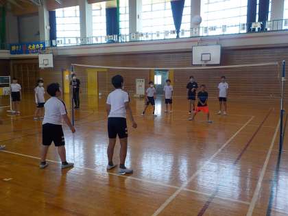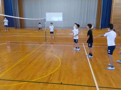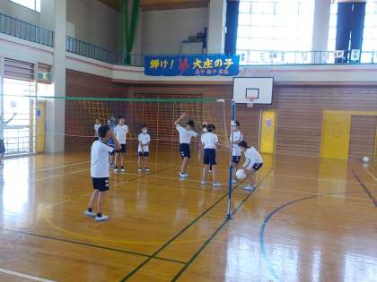 6年生は体育でビーチボールを行いました。トスをあげながらボールをつないで相手コートにかえす場面が見られました。