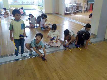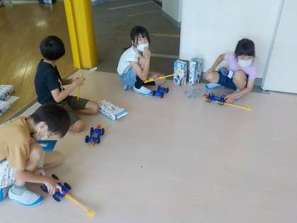 3年生は、風やゴムの力で動く車の実験を行いました。