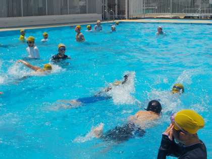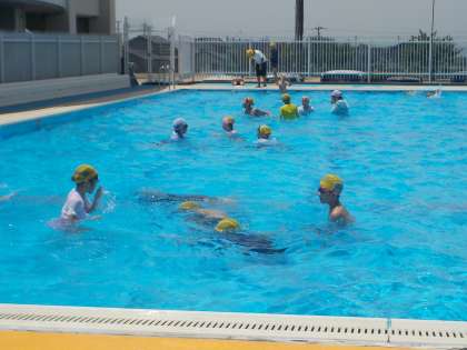 水泳学習です。天気も良く、気持ちよく入水することができました。記録をはかってみると、以前よりもグンと伸びている人もいました。