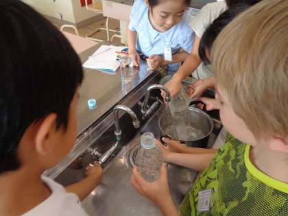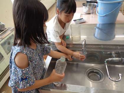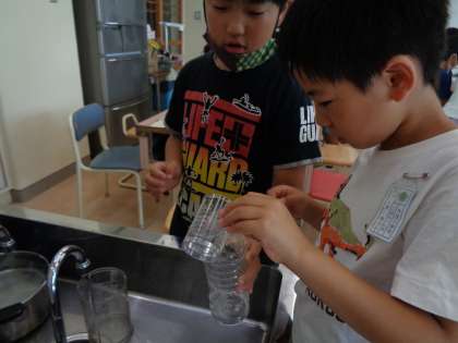 今日は、実際に鍋やコップにマスを使って水を入れてみました。それぞれの容器にどれだけの水が入るか、大体の目安が分かるようになった時間でした。