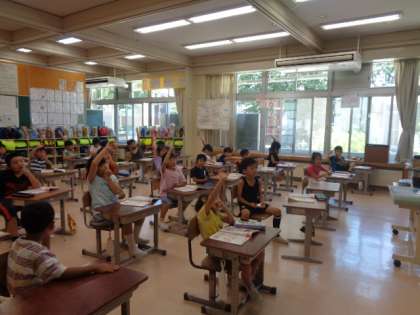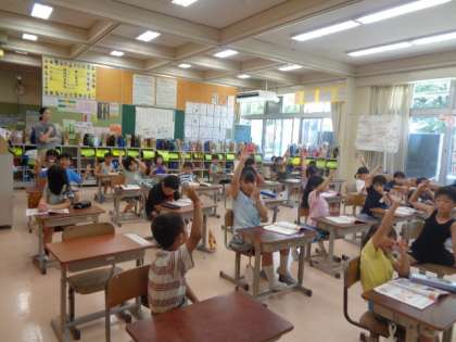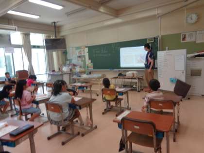 4時間目は、算数科「ながさくらべ」の学習でした。黒板に拡大提示された教科書の写真や、これまでの経験から、子供たちは長さを比較するときの大事なポイントに気付いていました。