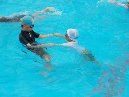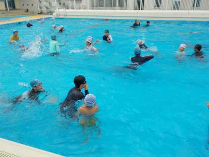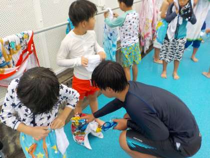 鬼ごっこや水中じゃんけん、ビート板で浮かぶなどのプールでの楽しい遊び方を教えてもらったり、泳ぎ方のコツを教えてもらったりしました。