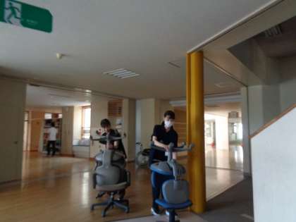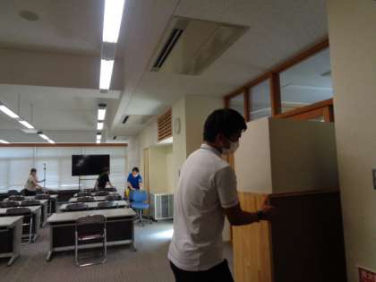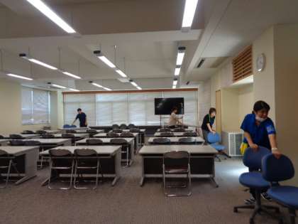明日からPC室の床カーペット張替え作業が始まります。それに先立って、職員でPC室に机や椅子、棚等を運び出しました。その後には、明日から始まる学校プール開放の更衣室づくり、各階のトイレ清掃にも精を出しました。2学期、PC室の床の様変わりをお楽しみに!
