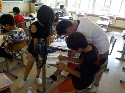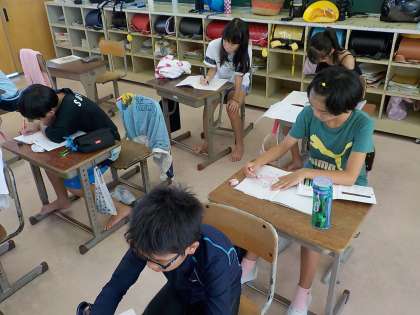 今日は4,5年生の登校日でした。子供たちは教室で夏のチャレンジの○付けや直しをしたり、課題を提出したりしました。