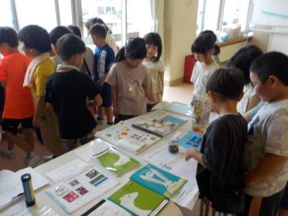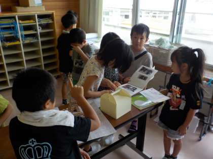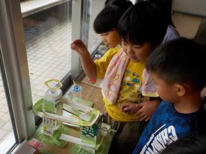 どの学年にも興味を引く研究があり、ノートをじっくりみたり、作品をのぞきこんで観察したりする姿が見られました。