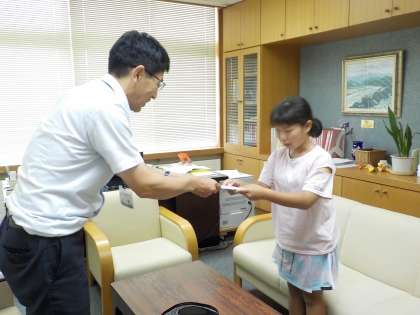 5年1組の鈴木さんが明日から始まるフェンシングの全国大会へ出場します。育成会と大山地区自治振興会からの激励金を渡しました。実りある大会になることを祈っています。元気に行ってきてください!