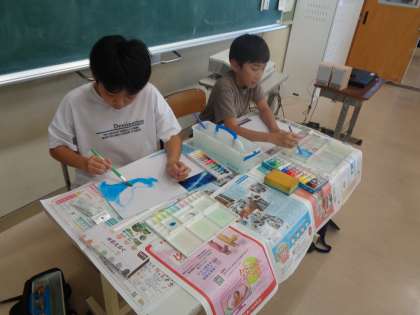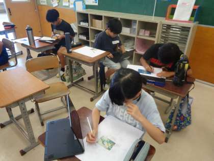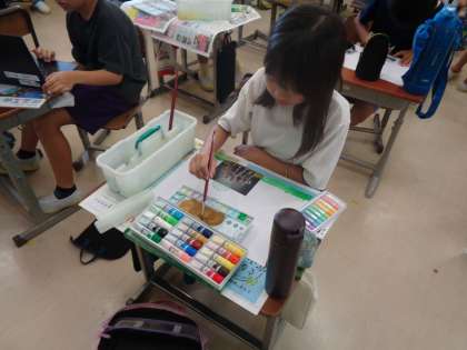 図工では、自分が選んだ写真の外の世界を想像して表す活動に取り組んでいます。前回は、外の世界を想像してみたい写真を選び、紙のどこに位置付けるか考えました。今日はさっそく外の世界を考え、下書きしたり色を塗ったりしました。写真とつなげて考えたり、関連するものをたくさん描いたりして、想像力豊かな作品に仕上がりそうです。完成が楽しみですね。