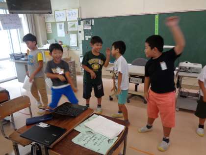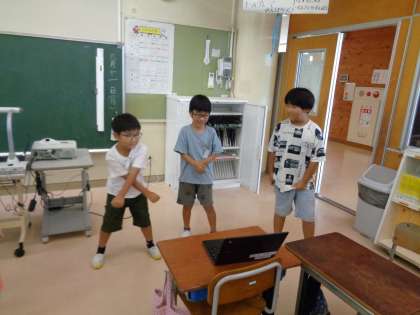 今日は、学習発表会の練習をしました。グループに分かれてダンスを考えます。自分たちの役や音楽に合ったダンスを一生懸命考えていました。