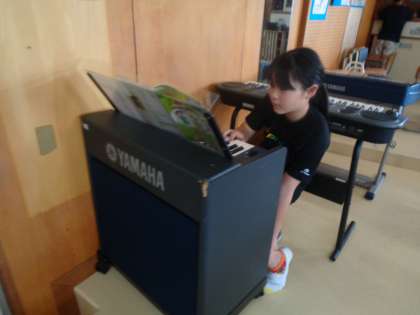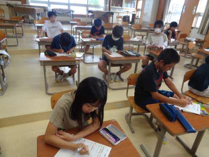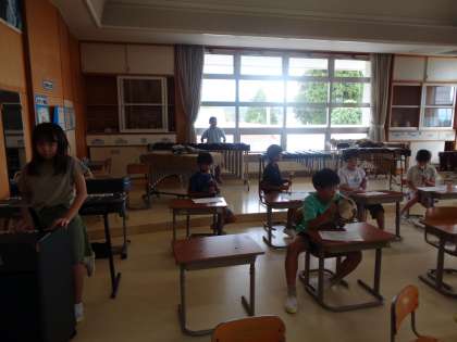 音楽では、グループにわかれて合奏をしました。同じメロディですが、楽器の組合せや繰り返しの回数を工夫して演奏することができました。グループのなかには、楽器の音の高さに注目して入る順番を考えているところもあり、子供のなかにはその工夫に気付き、鑑賞カードに書いている人もいました。音の重なりとひびきを楽しんで演奏したり、鑑賞したりすることができました。