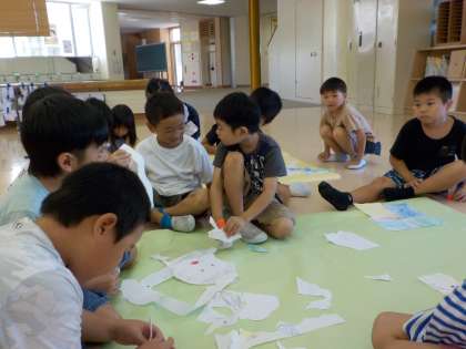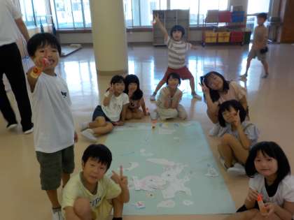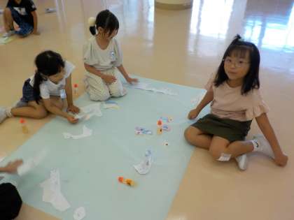どこに貼るとよいかを相談し、場所を譲り合ったり、空いている場所を教えてあげたりして、仲良く貼ることができました。