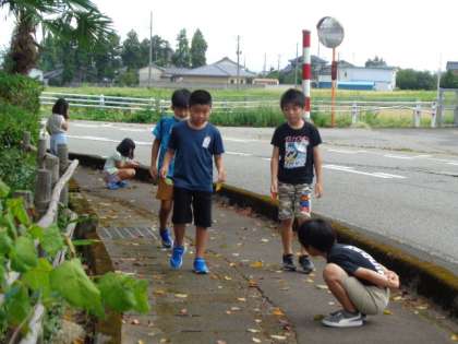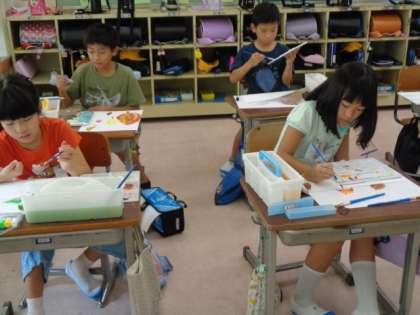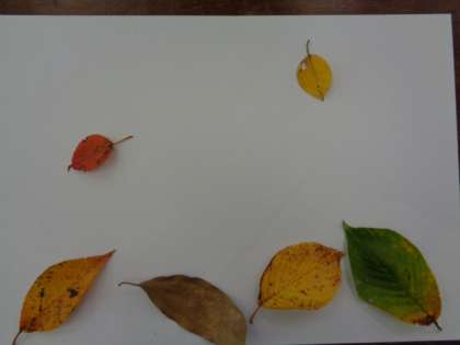 先週の金曜日の図画工作科の時間、お気に入りの葉っぱ探しになかよし広場付近に出ました。残暑厳しい蒸し蒸しする午前でしたが、木々には秋の気配が漂い始めていました。自分で選んだ葉っぱを教室に持ち帰り、じっくりと見ながら本物そっくりに描いていきました。