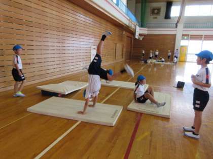 体育ではマット運動に取り組んでいます。前転や後転もスッと立ったり、開脚して立ったたりして2年生からバージョンアップしています。倒立系の技に挑戦している人もいます。来週は技をつなげて発表します。