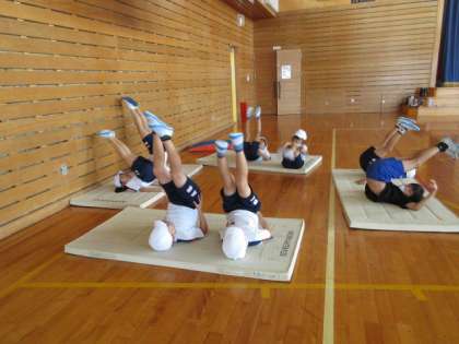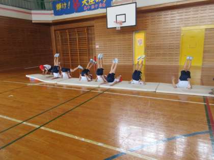 マット運動の発表会をしました。準備運動も念入りにします。ケガの無いように!みんなで背倒立1、2、の3。