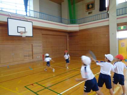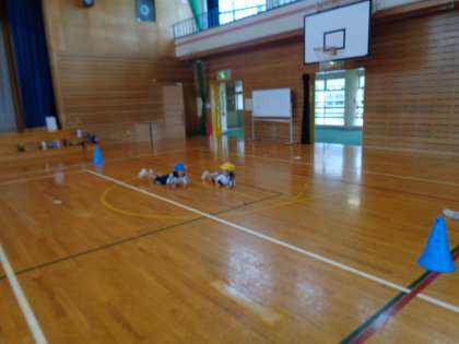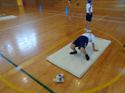 体育では、マット遊びとボール投げに挑戦しました。どうぶつ歩きをしたり、ブリッジやカエル足うちをしたりしました。ボール投げでは、的に向かって力強く投げることを意識して取り組みました。