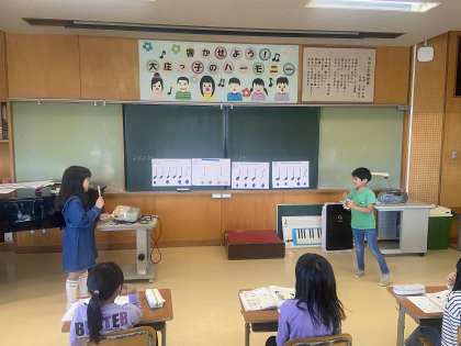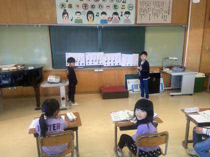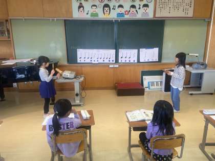 今日の音楽では、4つのリズムから2つ選び、呼びかけ役と答える役に分かれて楽器でリズムうちをしました。ウッドブロックやクラベスなど、自分の好きな楽器を選び、リズムよくおはなしをすることができていました。