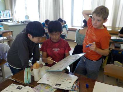今日の算数は、グラフをもとに問題を考えるものでした。グループで協力し、どうしてそうなるのか式や言葉で説明できるようにしています。一緒に考えたり、より分かりやすくなるように説明の言葉を考えたり。協力して取り組みました。