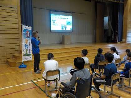 3〜6年生は6時間目にカターレ夢教室に参加しました。カターレ富山の背番号9番プロサッカー選手の「大野 燿平」さんをゲストに迎え、夢の実現に向かって日々努力し続けることをモットーに取り組む様子をお話していただきました。