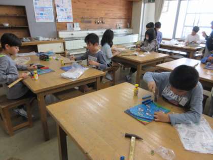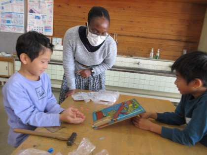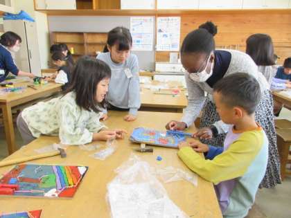 図工の時間に、板に釘を打ってコリントゲームを作りました。板に好きな絵を描いて、ポイント用の溝を釘やゴムで作り、ビー玉をはじいて遊びます。ユニークな絵や色鮮やかな絵を描いて、上手に仕上げていました。ALTのンダンゴ先生も来られて、一緒にゲームを楽しみました。