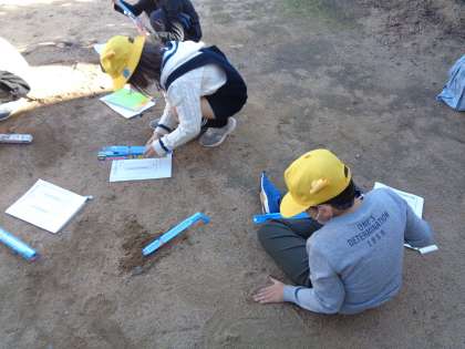 今日は、日なたと日かげの地面の温度を調べました。「かげおくりができそうな天気だね。」と誰かがつぶやいたほど、今日は日なたと日かげの差がはっきりしていました。温度計の扱いに気を付けながら調べていました。