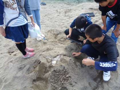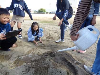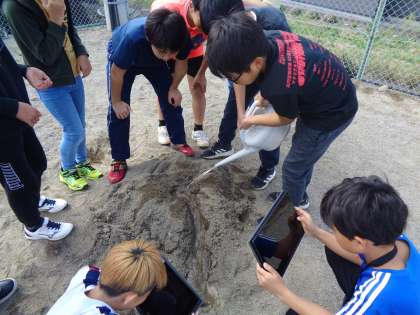 理科では、流れる水にはどのようなはたらきがあるのか、流れる水の量や速さによってはたらきの大きさは変わるのかについて実験しました。水の量を調節したり、山の傾斜を調節したりして条件を変えて実験しました。クロムブックで動画を撮影し、繰り返し確認しながら考察する姿もありました。水の流れや、周りの様子に注目して考えることができました。