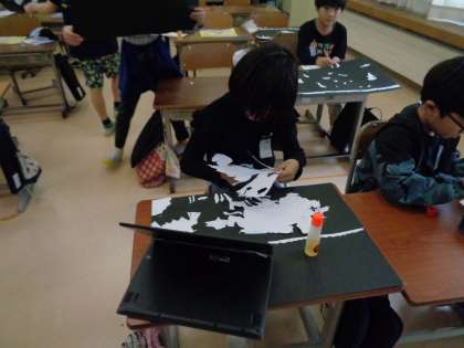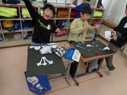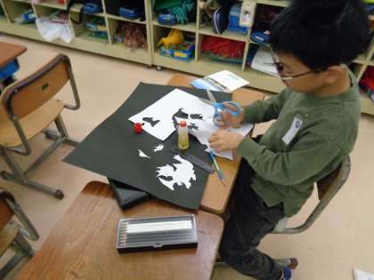 今日の図工は、はさみのアートを完成させました。紙を集めて魚の形に見立てたり、フルーツや虫の形に切ったりして素敵な作品が出来上がりました。