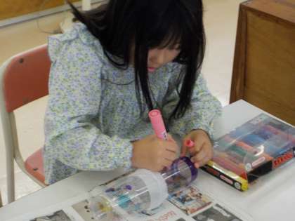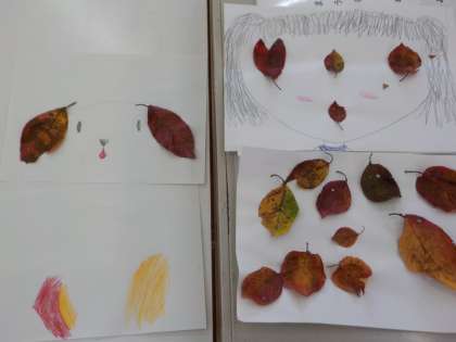 紙コップにドングリを入れてマラカスを作ったり、落ち葉のこすり出しや落ち葉の絵を描いたりしています。