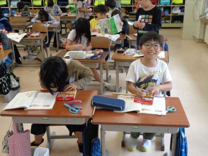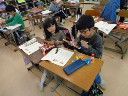 今日の国語は、馬のおもちゃの作り方を読みながら実際に作りました。長さをしっかり測って印をつけたり、写真をみながら部品を重ねてホッチキスでとめたりして作りました。