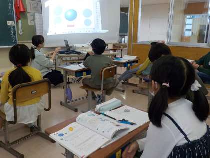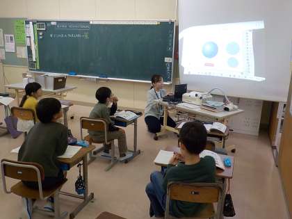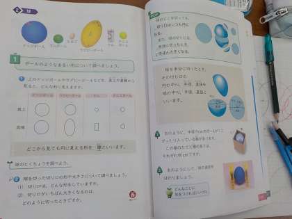 3年生は算数科で、球の特色について考えました。まん丸な形の球は、どこで切り取っても円になることが分かり感心していました。
