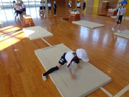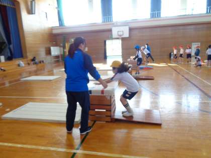 今日の体育は、スポーツ指導員の方に跳び箱を教えてもらいました。きれいに上手に跳べる練習方法を教えてもらい、前よりも上手に跳べるようになった子供がたくさんいました。