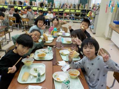今日は、給食係の企画で、初めての席替え給食をしました。