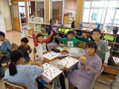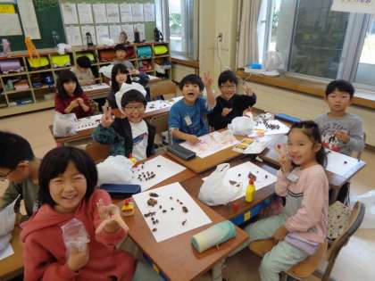 今日の図工では、校外学習で集めたどんぐりや葉を使ってお絵かきをしました。どんぐりを並べたり、葉をちぎって貼ったりするなど、思い思いに秋を描いていました。