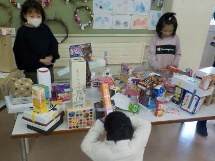 1年生前のワークスペースに様々な箱を組み合わせた図工作品が展示されています。