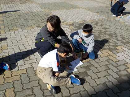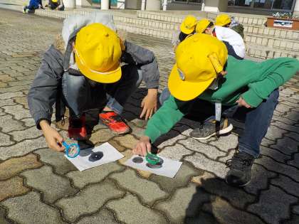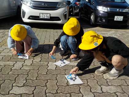3年生は理科で、虫眼鏡を使って日光を集める実験を行いました。上手に光を集めた子供は、黒塗りにした用紙から煙が出たり、穴が開いたりして、光を集めることを楽しんでいました。